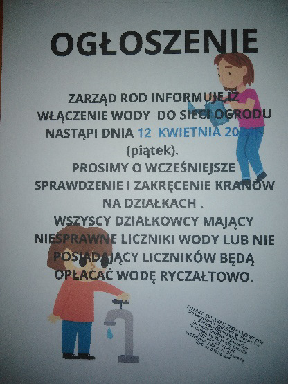 Zarząd ROD im. E. Gierczak informuje, iż 12 kwietnia 2024 r. nastąpi włączenie wody do sieci ogrodu.